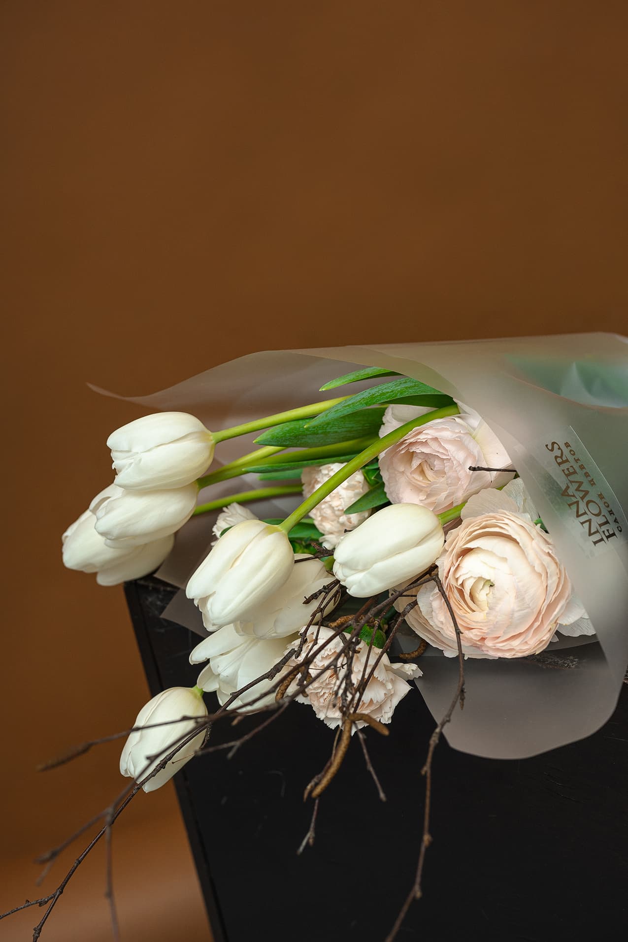 Один элегантный цветок расскажет больше, чем пышный букет. Тенденция склоняется к нейтральным и естественным палитрам: белый, зеленый, пастельный розовый – все это создает атмосферу спокойствия. Такие букеты словно шепчут, а не кричат, делая их идеальным выбором для современного интерьера.